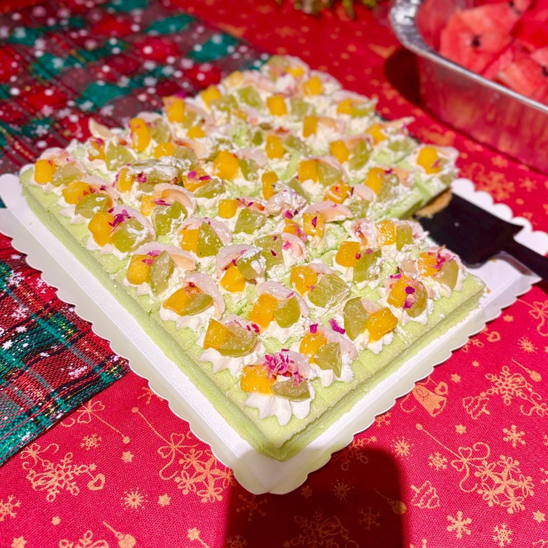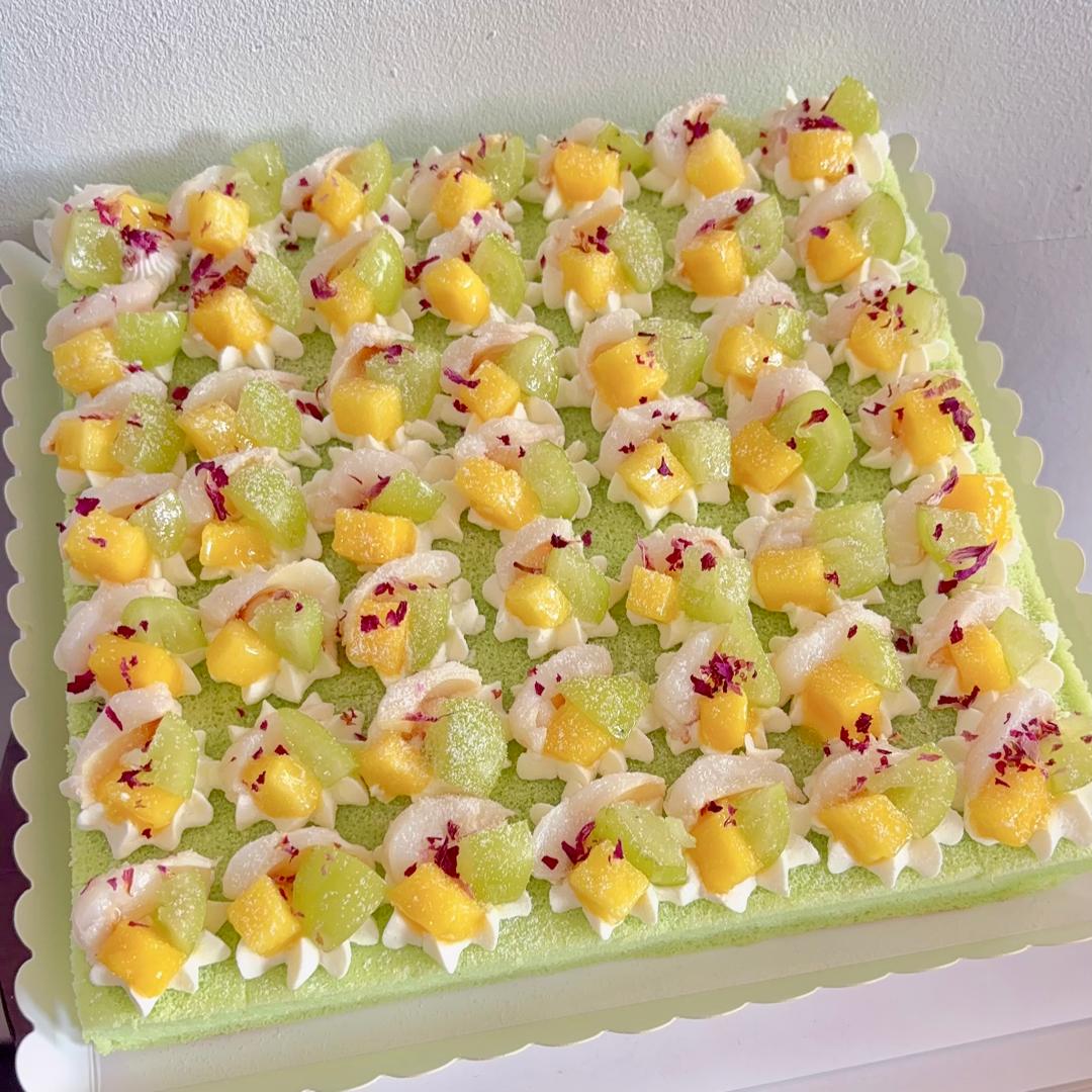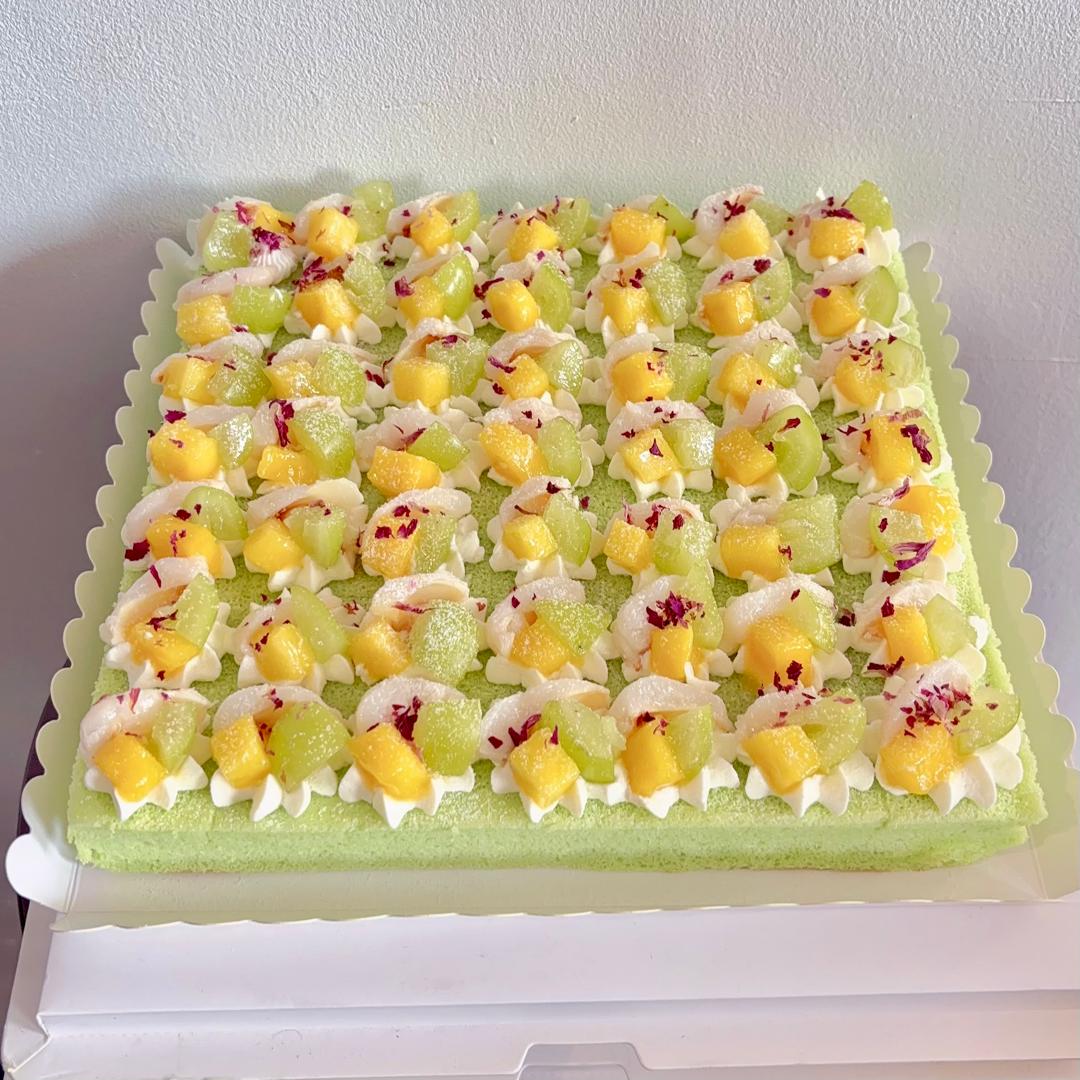 Our signature Pandan Chiffon topped with whipping cream, mango, grape and lychee.