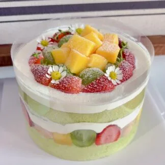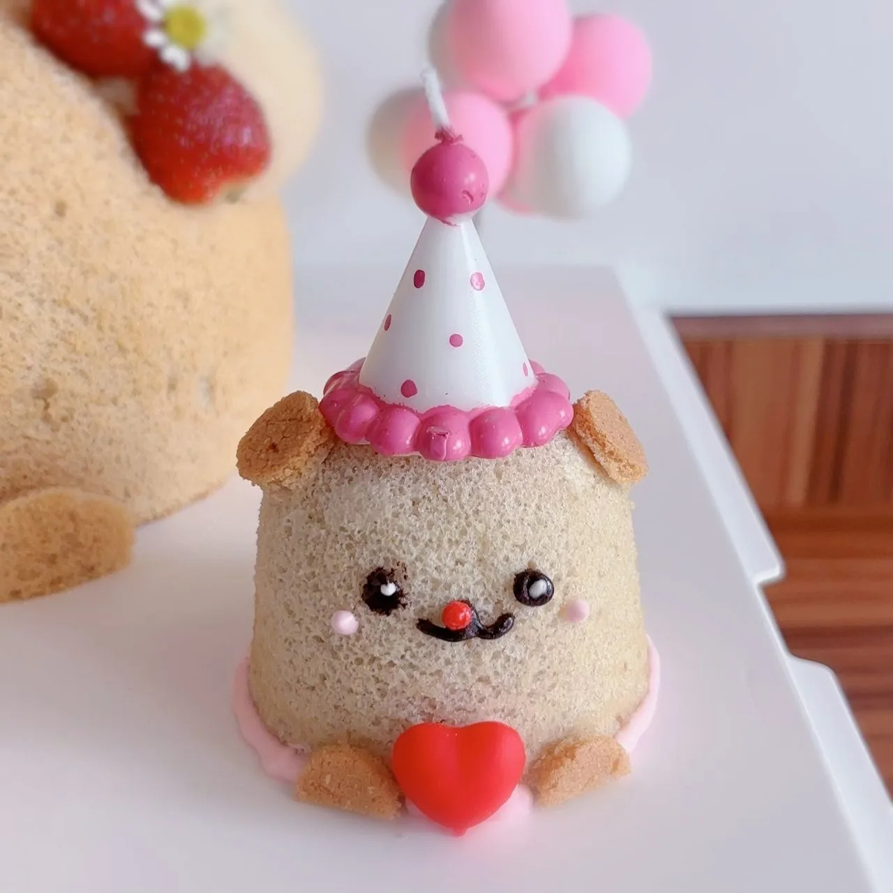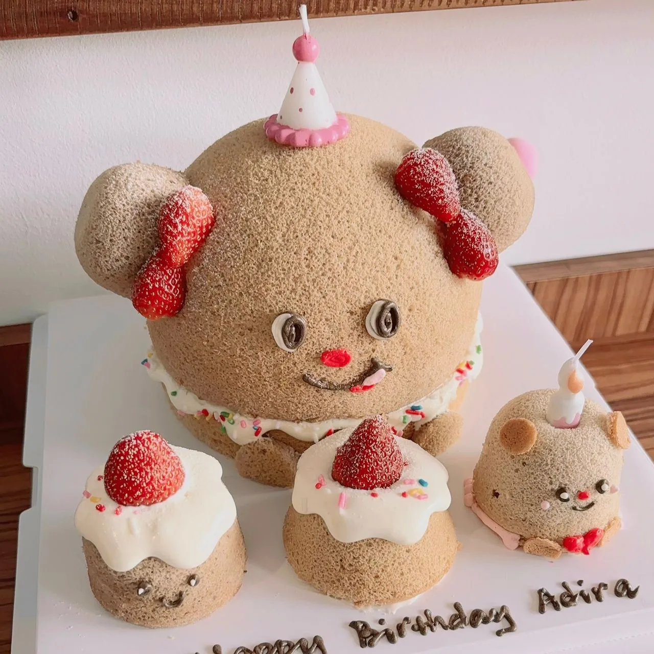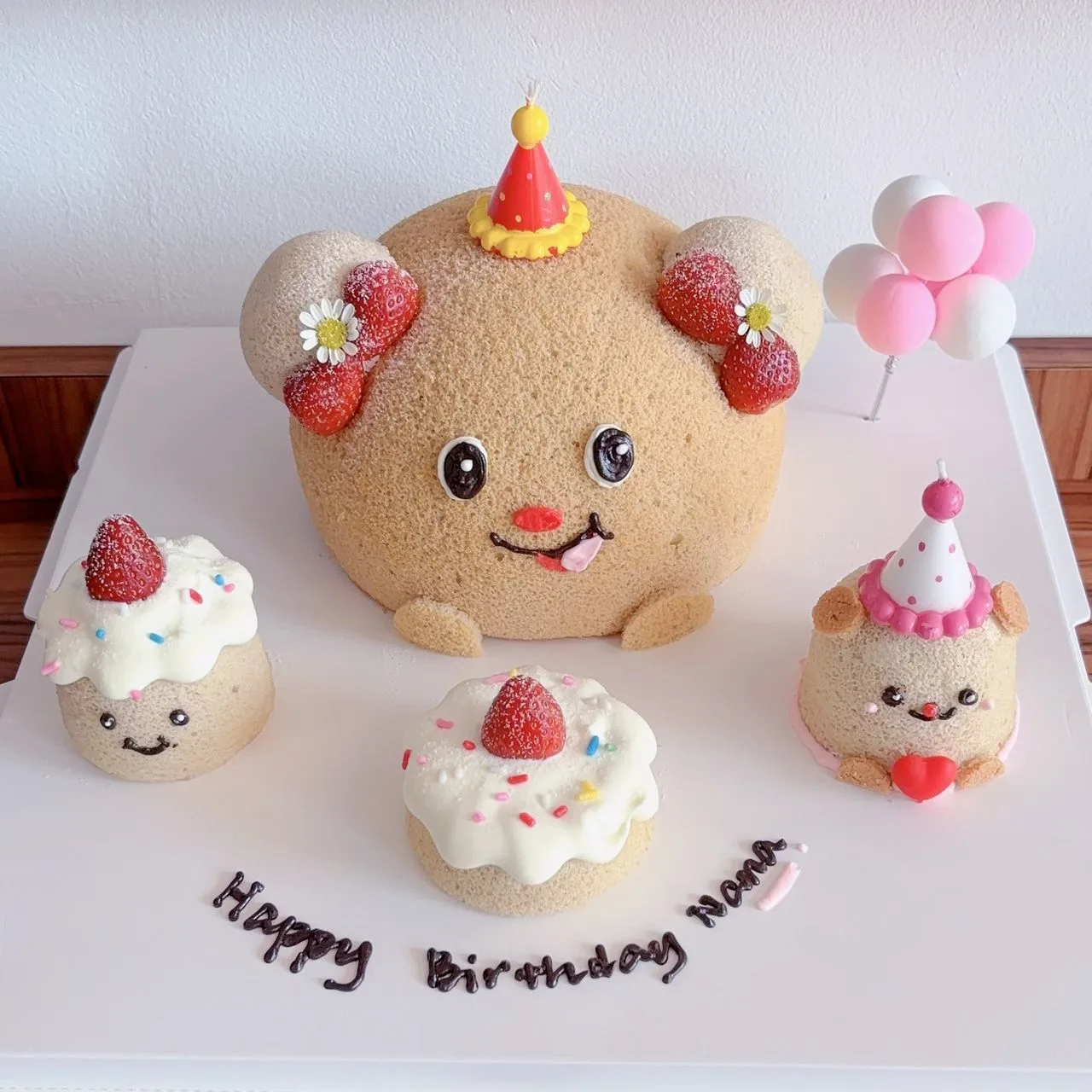 Big Teddy is made with light chocolate flavour chiffon filled with strawberries, lychee and lava cream. Mini cakes are topped with whipping cream and strawberry.