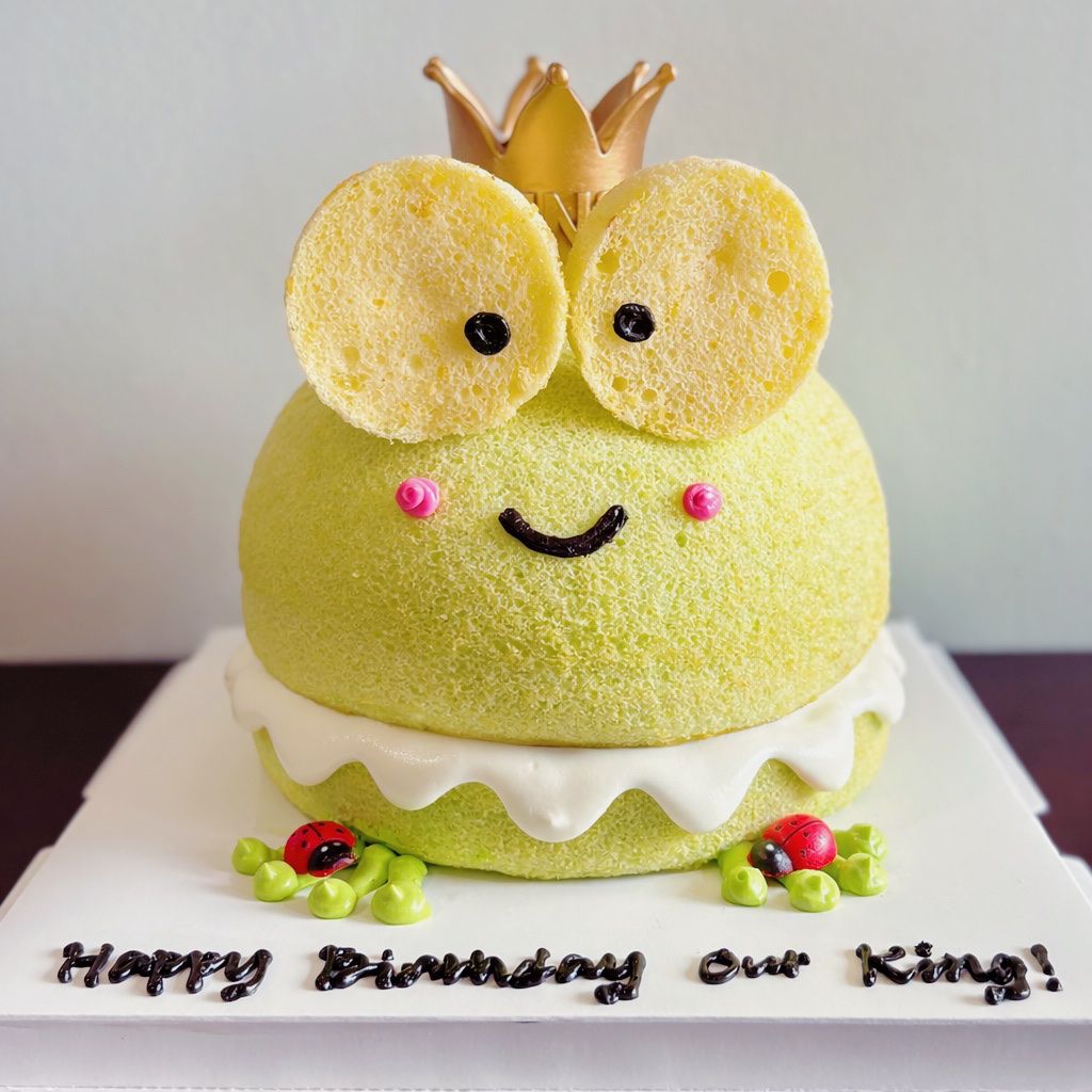 Topped with two big frog eyes made with chiffon and crown figuring (inedible).
