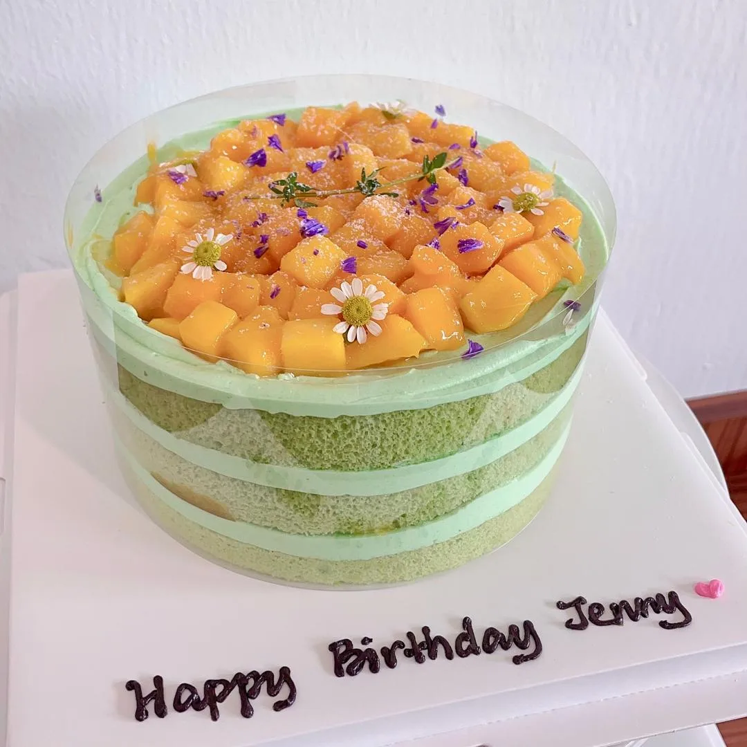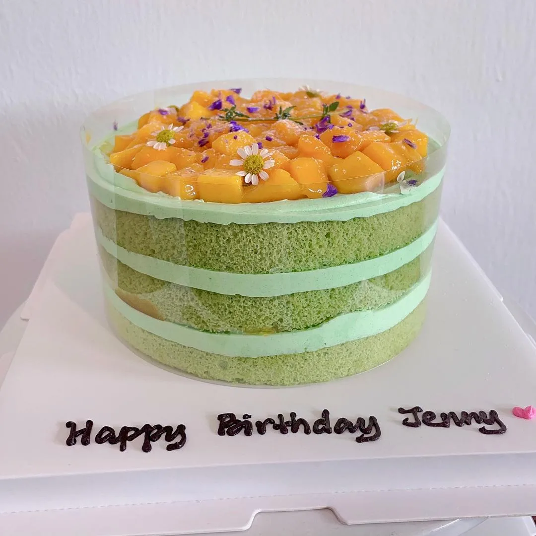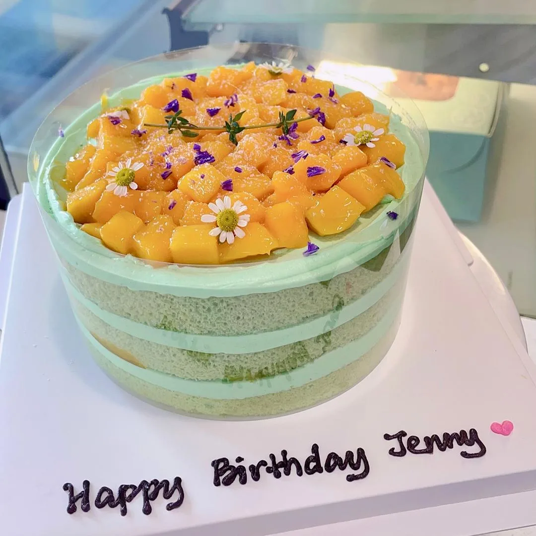 Made with our popular pandan Chiffon, baked with 100% natural pandan juice from pandan leaves and coconut milk. The cake is dressed with pandan infused buttercream, filled with fresh mango cubes and topped with more mangoes.