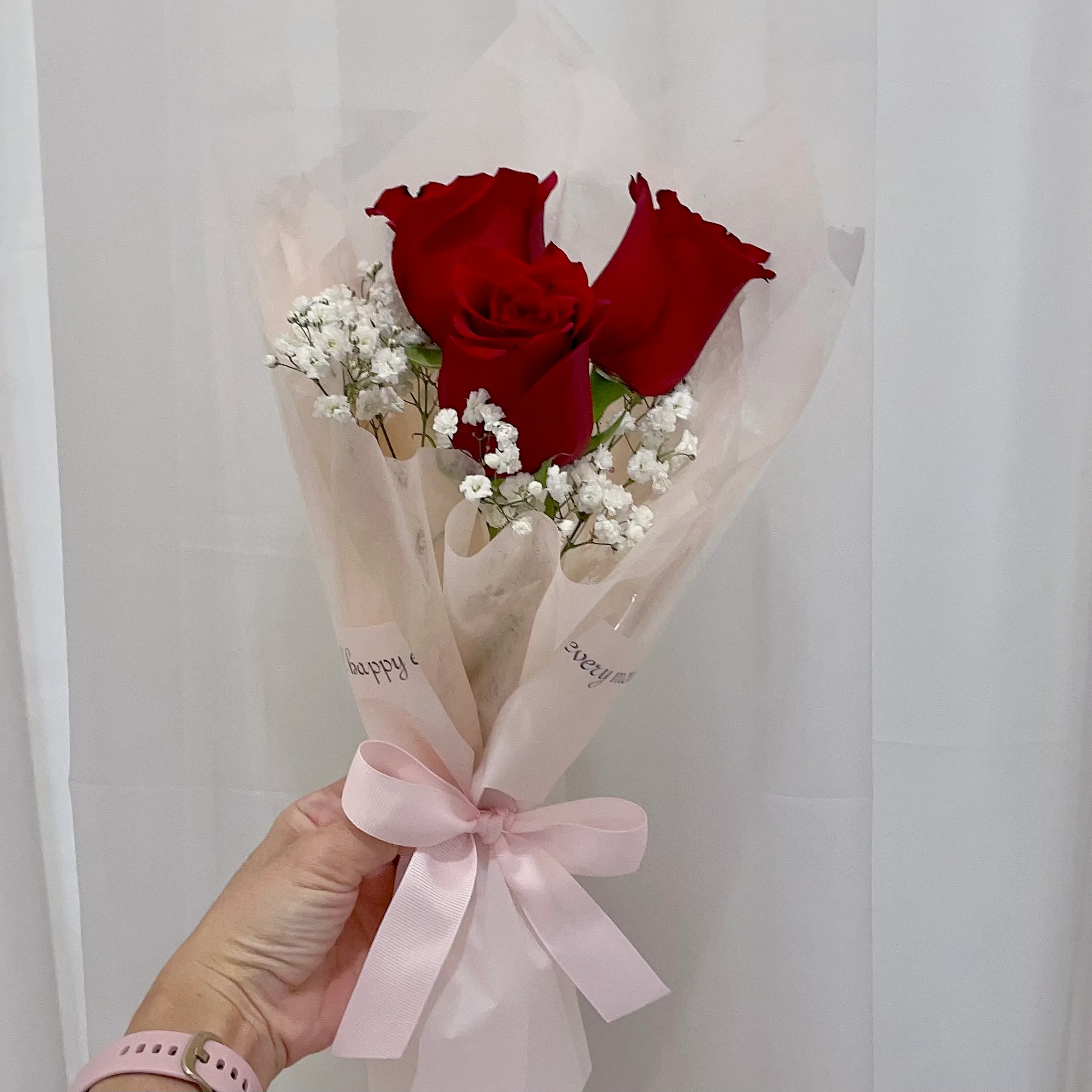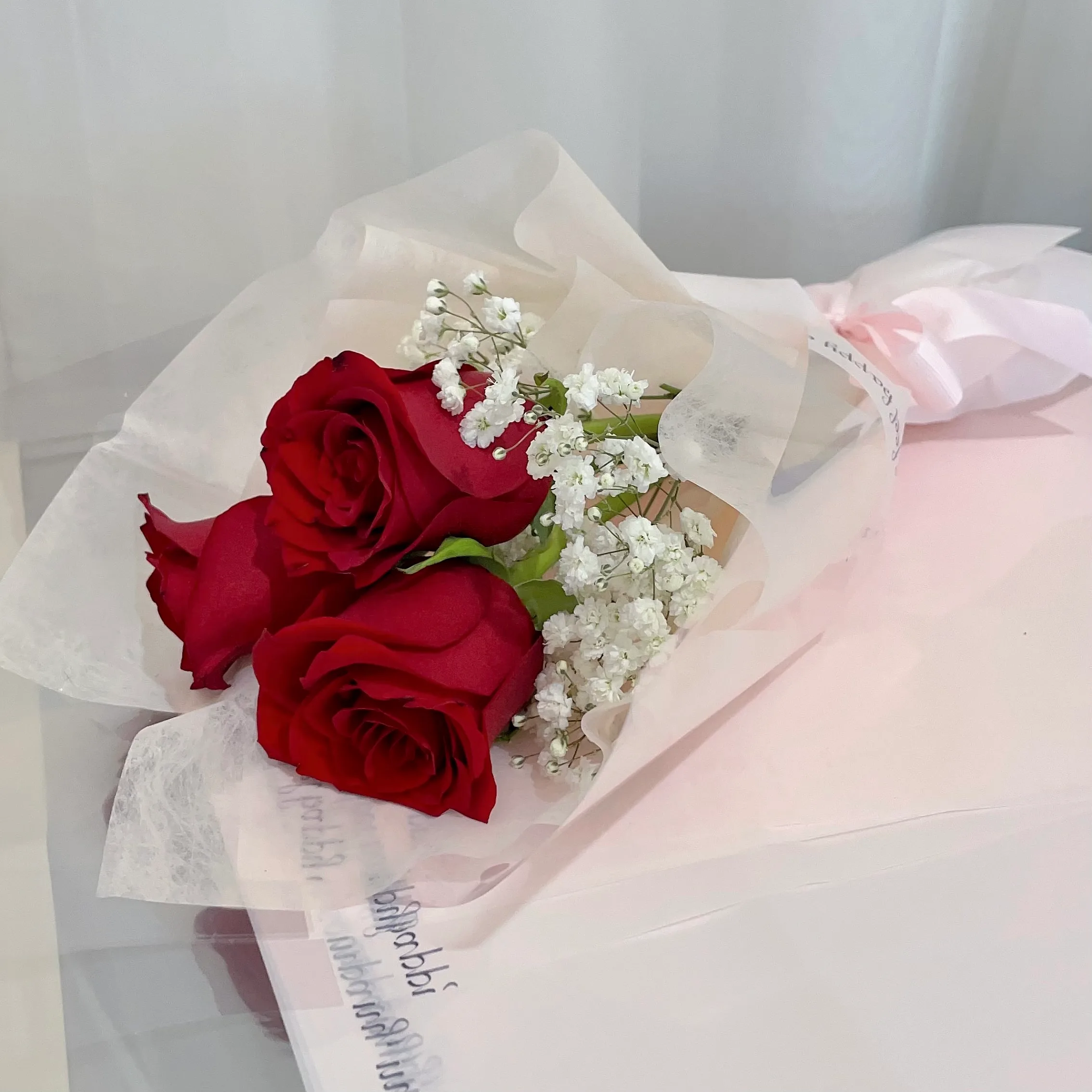 Fresh bouquet consists of 3 stalks red roses and baby breath.